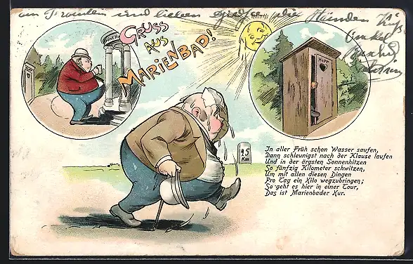 Lithographie Marienbad, In aller Früh schon Wasser lassen..., Scherz