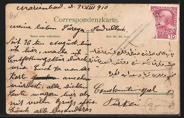 gelaufen 1910, Briefmarke entfernt, rückseitig Oberflächenschaden, Eckknick re. unten, guter Zustand