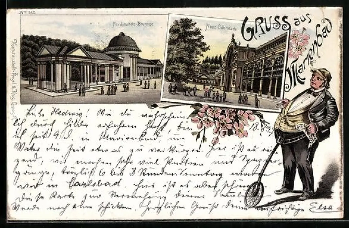 Lithographie Marienbad, Neue Colonnade, Ferdinands-Brunnen