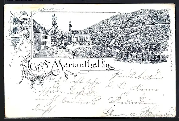 Lithographie Marienthal i. Rhg., Partie im Ort mit Blick auf die Kirche