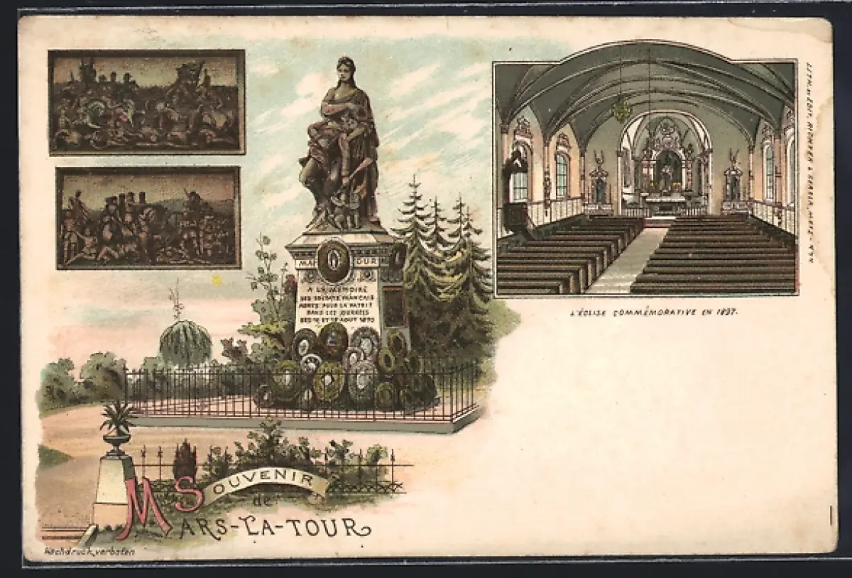 Lithographie Mars-la-Tour, Monument commémoratif et intérieur de l`église en 1897