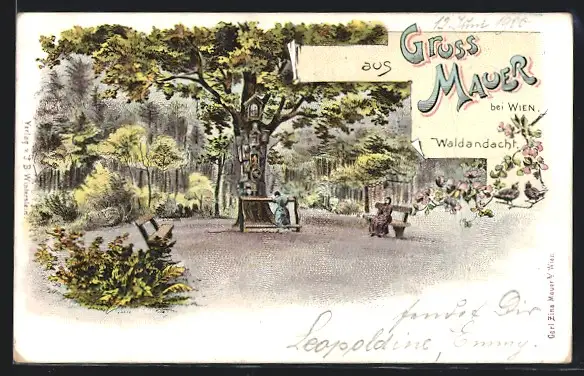 Lithographie Mauer bei Wien, Frau bei der Waldandacht