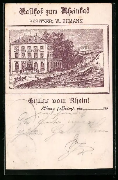 Lithographie Maxau i. Baden, Gasthof zum Rheinbad