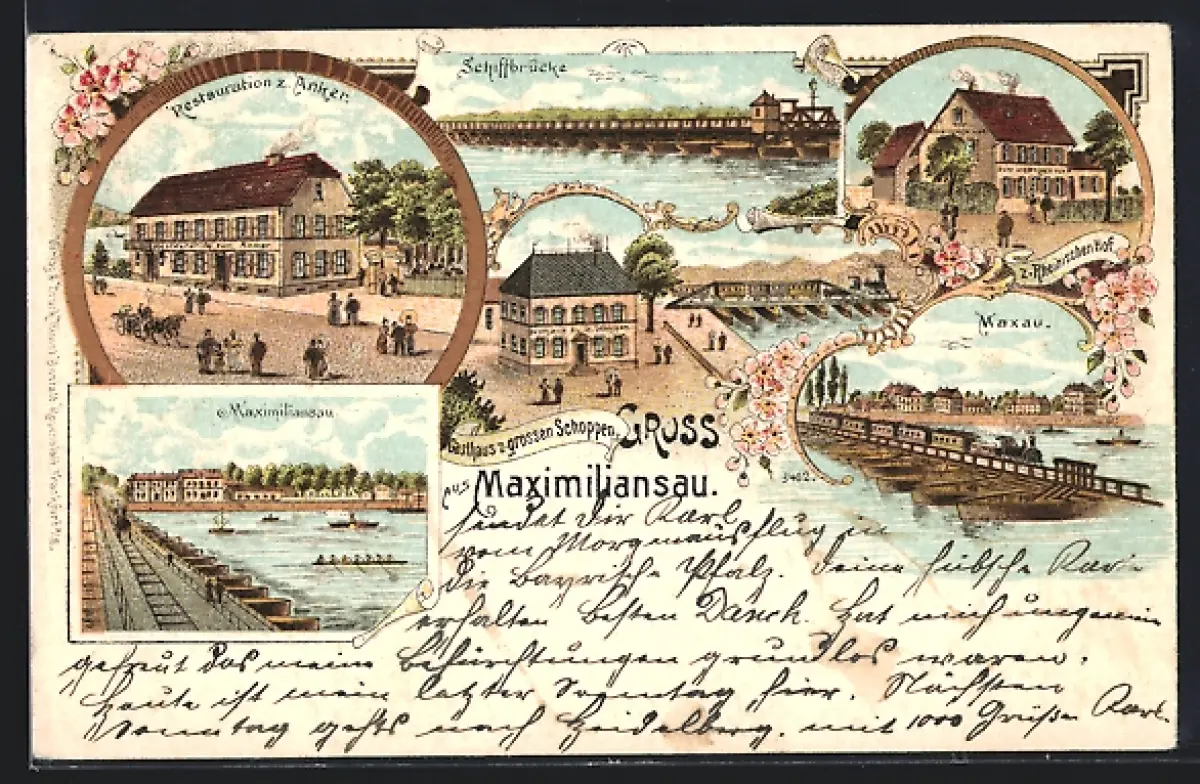 Lithographie Maximiliansau, Restaurant zum Anker, Schiffbrücke, Gasthaus z. grossen Schoppen, Maxau, Ortsansicht
