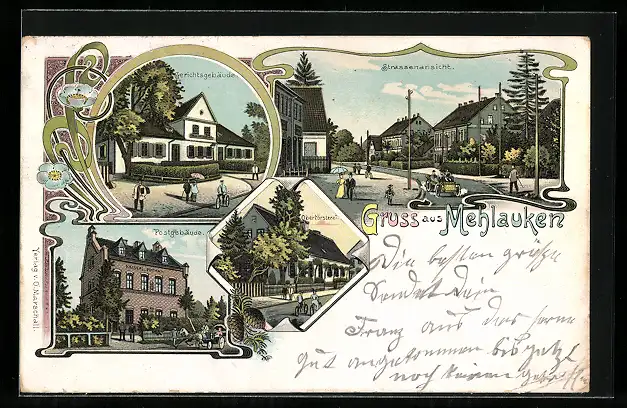 Lithographie Mehlauken, Strassenansicht, Gerichtsgebäude und Oberförsterei