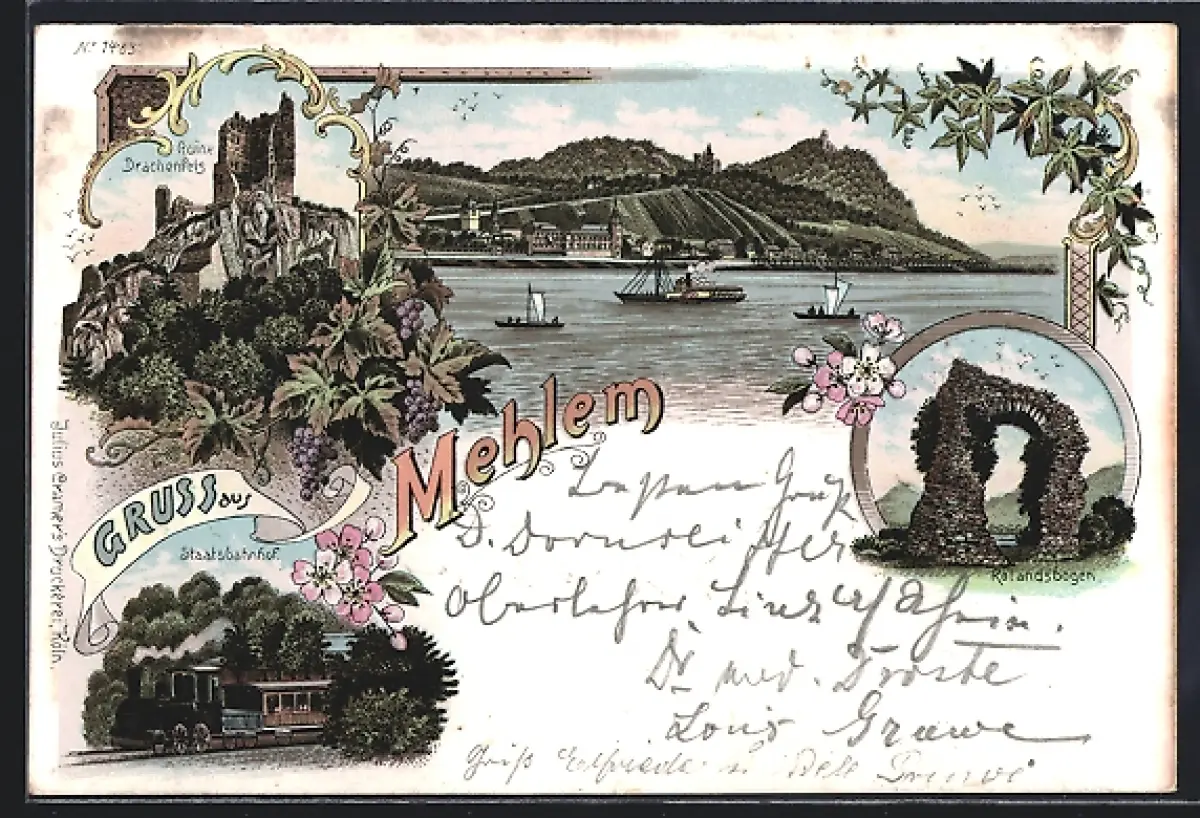 Lithographie Mehlem, Ruine Drachenfels, Staatsbahnhof, Rolandsbogen