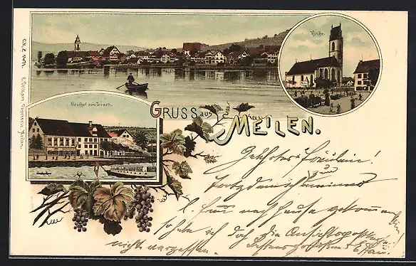 Lithographie Meilen, Gasthof zum Löwen, Kirche und Blick auf das Ufer