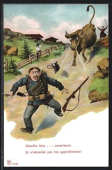 Lithographie Meinst du Cheib! - I blyb der stah?..., schweizer Soldatenhumor