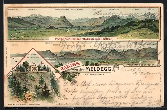 Lithographie Meldegg, Gasthaus zur Meldegg, Panorama von der Meldegg gegen Süden mit Alvier, Altmann und Säntis