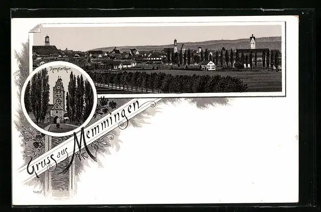 Lithographie Memmingen, Kempterthor, Totalansicht aus der Ferne