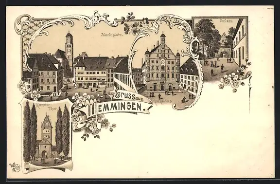 Lithographie Memmingen, Marktplatz, Rathaus, Kempter-Thor