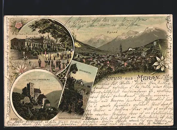 Lithographie Meran, Kurhaus u. Promenade, Schloss Lebenberg, Braunsberg
