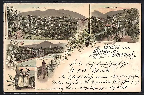 Lithographie Meran, Obermais, Gilfpromenade, Wandelhalle, Passeyer Tor