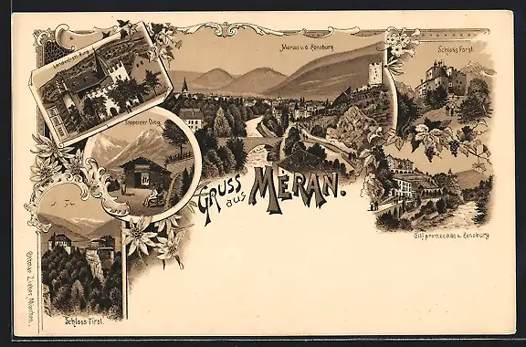 Lithographie Meran, Ortsansicht von der Zenoburg, Schloss Forst, Tappeiner Weg