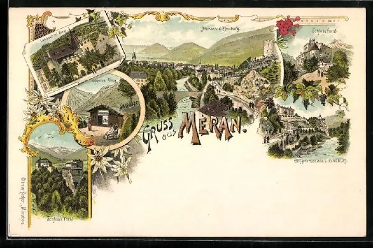 Lithographie Meran, Teilansicht des Ortes, Schloss Farst, Schloss Tirol und Landesfürstliche Burg
