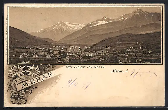Lithographie Meran, Totalansicht mit Gebirgspanorama