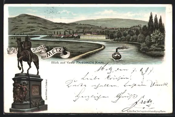 Lithographie Metz, Blick auf Veste Friedrich Karl mit Dampfer, Denkmal