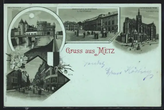 Lithographie Metz, Deutsches Tor, Römerstrasse, Kathedrale vom Paradeplatz