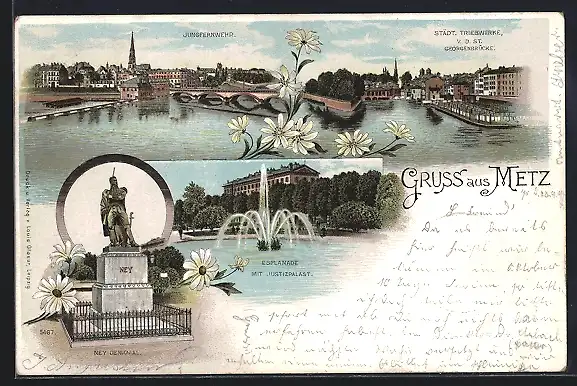 Lithographie Metz, Esplanade mit Justizpalast, Ney Denkmal, Städt. Triebwerke