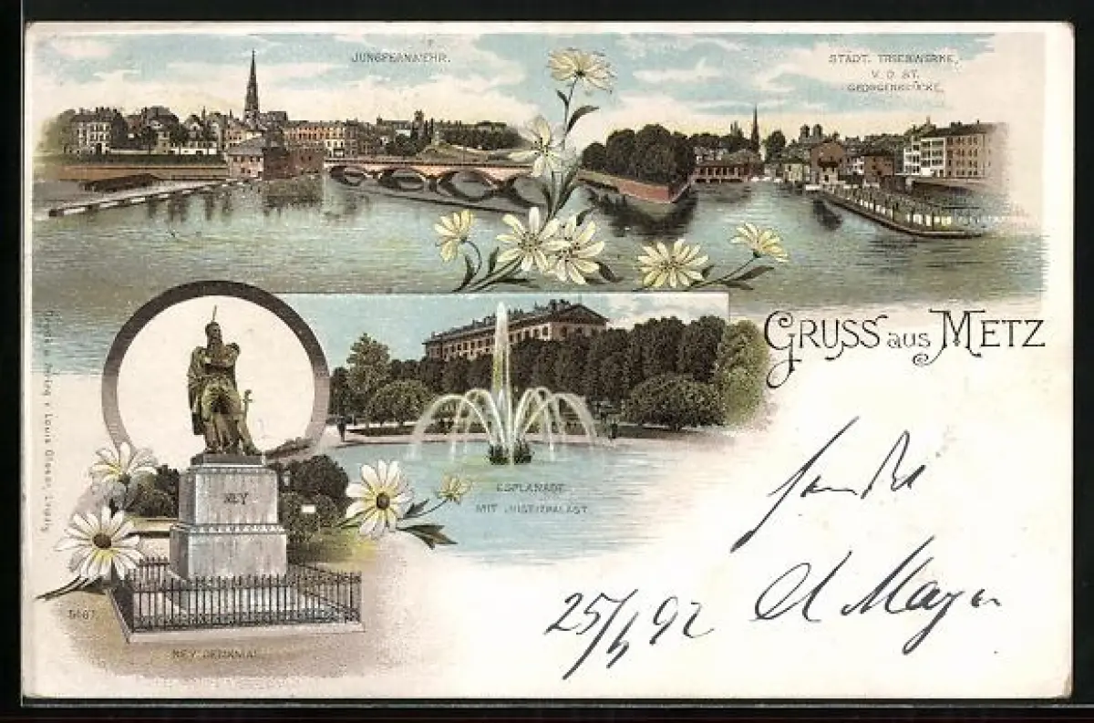 Lithographie Metz, Esplanade mit Justizpalast, Städt. Triebwerke, Ney Denkmal, Jungfernwehr