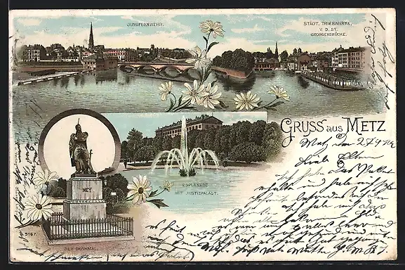 Lithographie Metz, Jungfernwehr, Städt. Triebwerke, Ney-Denkmal