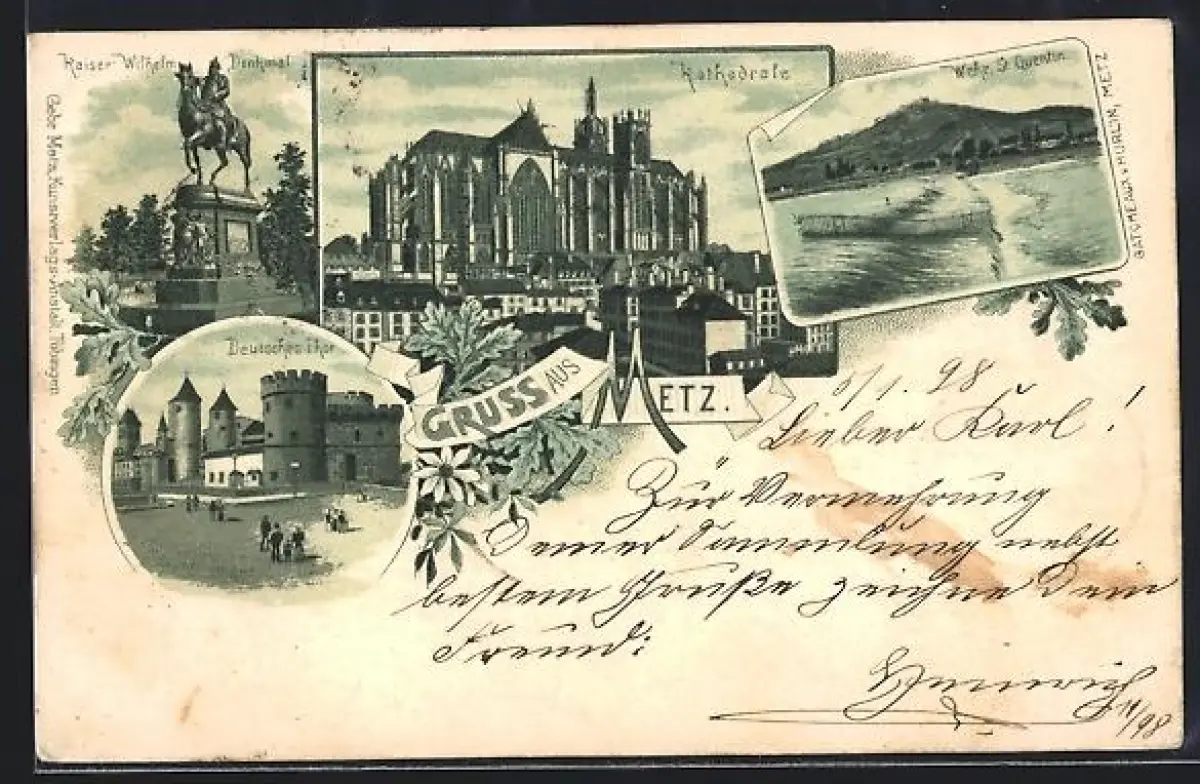 Lithographie Metz, Kathedrale, Deutsches Tor, Kaiser-Wilhelm-Denkmal