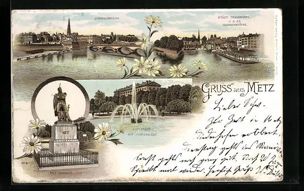 Lithographie Metz, Städtische Triebwerke an der Georgenbrücke, Justizpalast