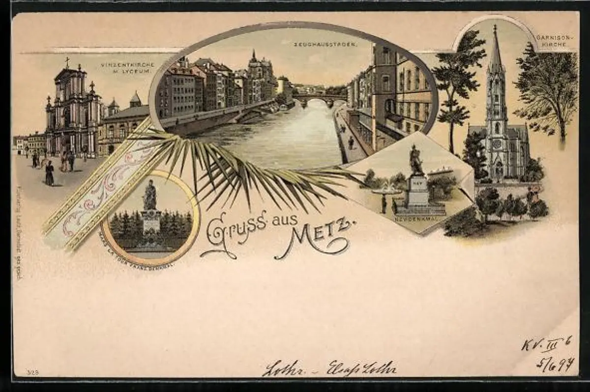 Lithographie Metz, Zeughausstaden, Garnisonkirche und Vinzenzkirche