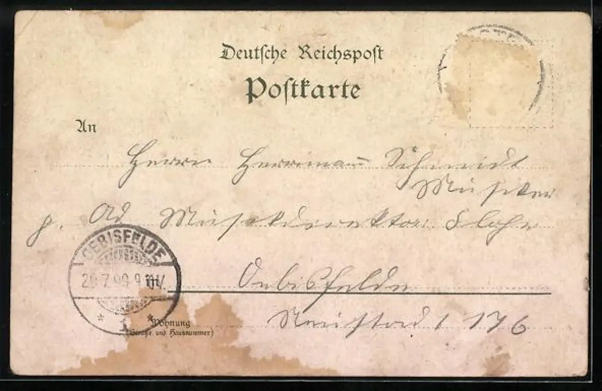 Personenbezogene Daten auf der Rückseite der Karte wurden durch blauen Textmarker unkenntlich gemacht. Die blauen Stellen sind auf die Vorderseite durchgeweicht und wirken sich negativ auf das Postkartenfoto aus