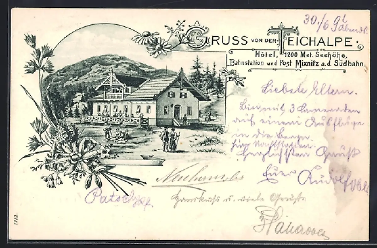 Lithographie Mixnitz, Hotel Teichalpe mit Gästen