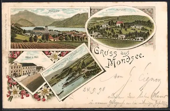 Lithographie Mondsee, Hotel z. Post, Landungsplatz und Bahnhof, Mariahilf