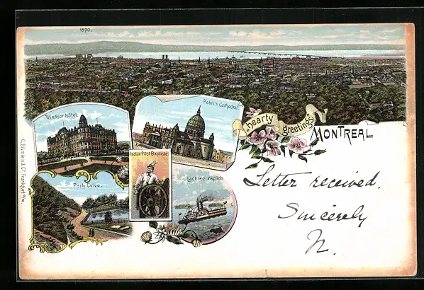 Lithographie Montreal, Windsor Hotel, Peter`s Cathedral, Lachine rapids