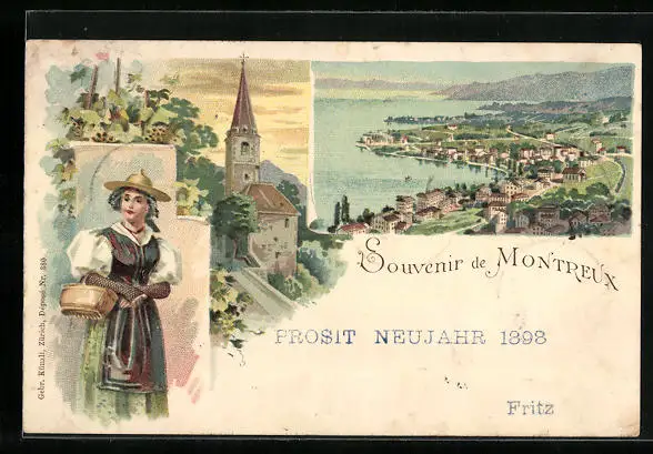 Lithographie Montreux, Ortsansicht, Kirche, Trachtenmädchen