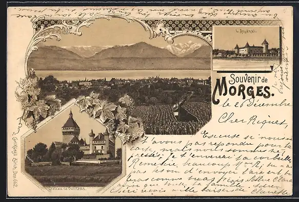 Lithographie Morges, Totalansicht mit Alpen, l`Arsenal, Chateau de Vufflens
