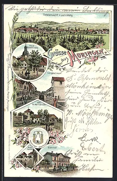 Lithographie Moringen, Bahnhof m. Eisenbahn, Langestrasse, Neue Stadtkirche