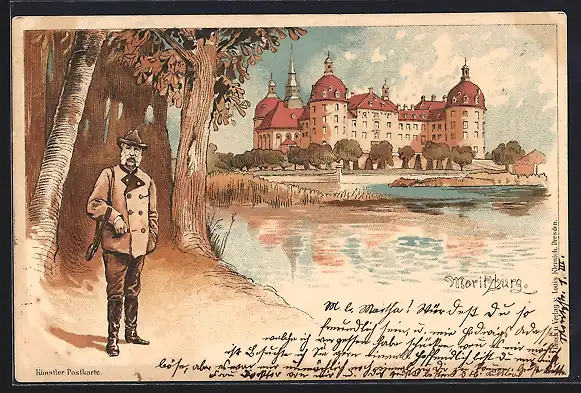 Lithographie Moritzburg / Sachsen, Jäger vor dem Schloss Moritzburg