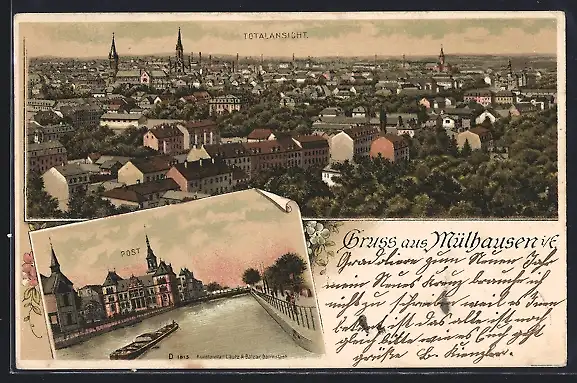 Lithographie Mülhausen, Binnenschiff im Kanal, Totalansicht
