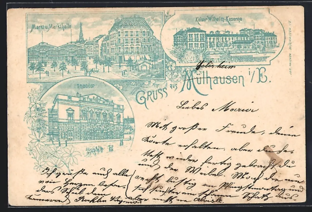 Lithographie Mülhausen i. E., Theater, Markt und Markthalle, Kasier-Wilhelm-Kaserne