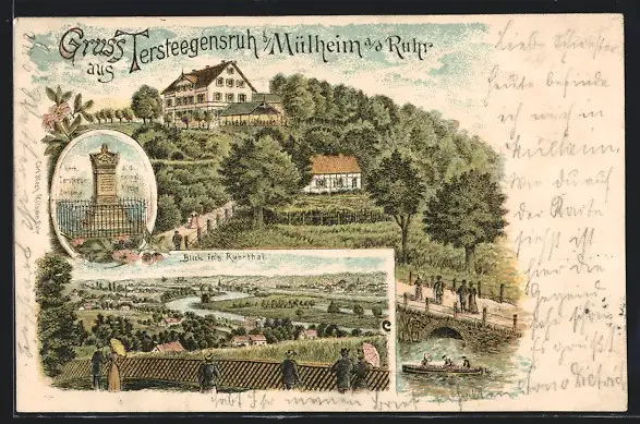 Lithographie Mülheim / Ruhr, Gasthaus Tersteegensruh, Tersteege-Denkmal, Blick ins Ruhrtal