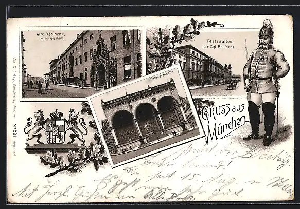 Lithographie München, Alte Residenz, Festsaalbau, Feldherrnhalle, Soldat in Uniform, Wappen