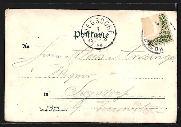 gelaufen 1904, Briefmarke entfernt, rückseitig Oberflächenschaden, Bugspur li. oben