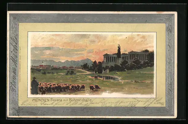 Lithographie München, Bavaria mit Ruhmeshalle