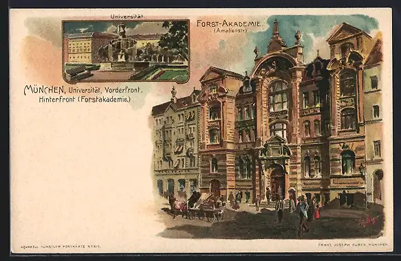 Lithographie München, Forst-Akademie (Amalierstrasse) Hinterfront, Universität Vorderfront