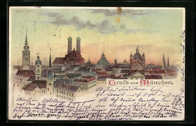 Lithographie München, Frauenkirche, St. Peter, Theatinerkirche u.a., Lichter in den Fenstern, Halt gegen das Licht