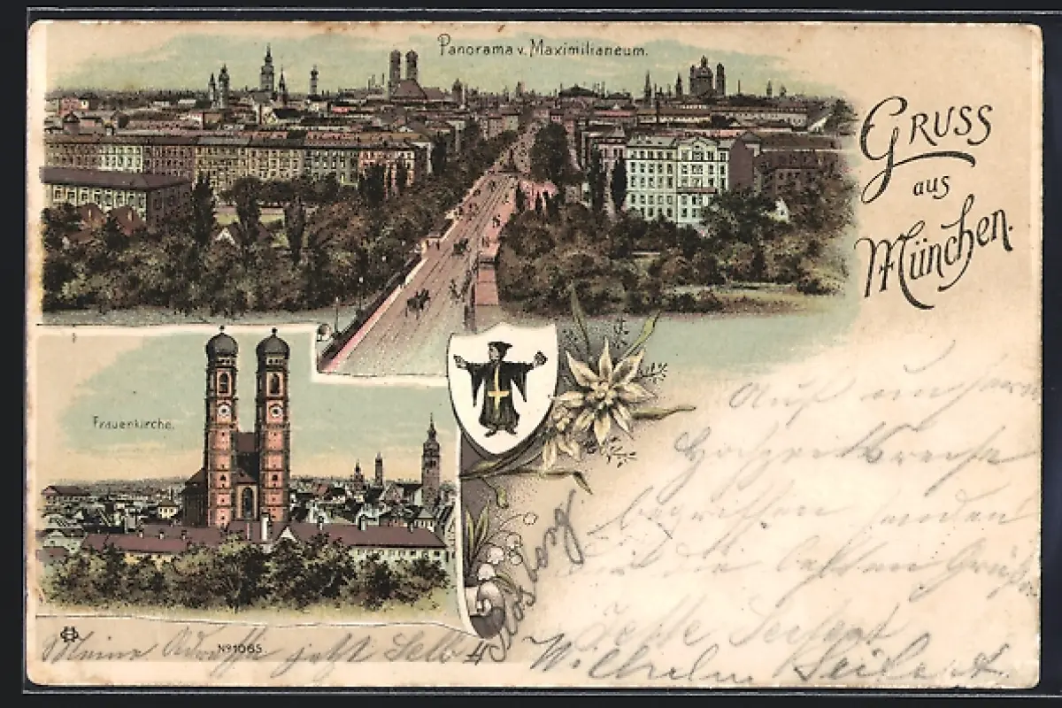 Lithographie München, Frauenkirche mit Panorama v. Maximilianeum