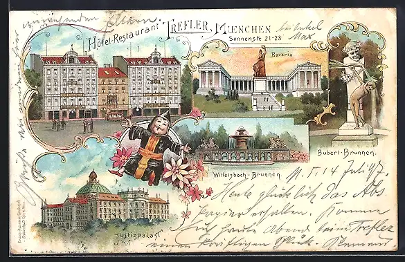 Lithographie München, Hotel Restaurant Trefler in der Sonnenstrasse 21-28, Justizpalast, Buberl-Brunnen