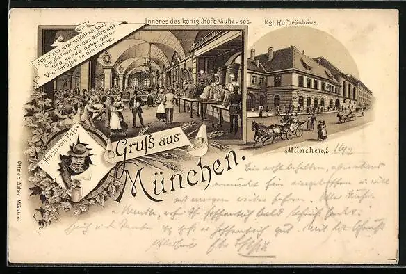 Lithographie München, Königliches Hofbräuhaus, Mann mit Bier - frisch vom Fass