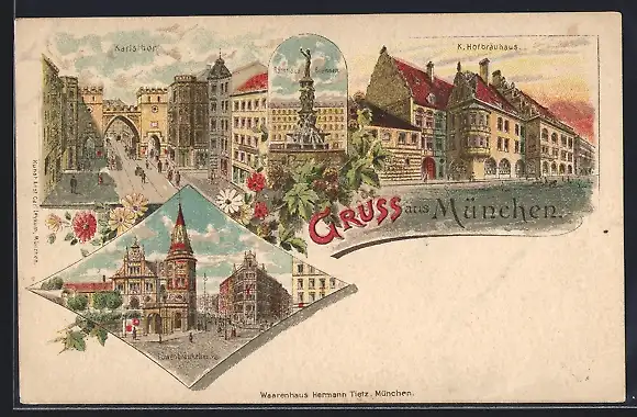 Lithographie München, Münchner Hofbräuhaus, Aussenansicht, Karlstor, Löwenbräukeller
