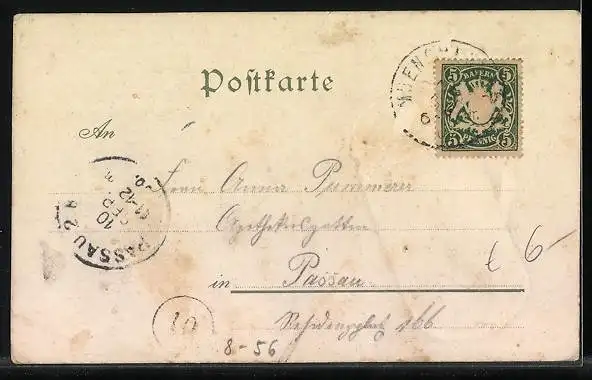 Personenbezogene Daten auf der Rückseite der Karte wurden durch blauen Textmarker unkenntlich gemacht. Die blauen Stellen sind auf die Vorderseite durchgeweicht und wirken sich negativ auf das Postkartenfoto aus