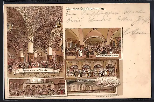 Lithographie München, Münchner Hofbräuhaus, Innenansichten Kleine Bierhalle und Küchengang im Parterre